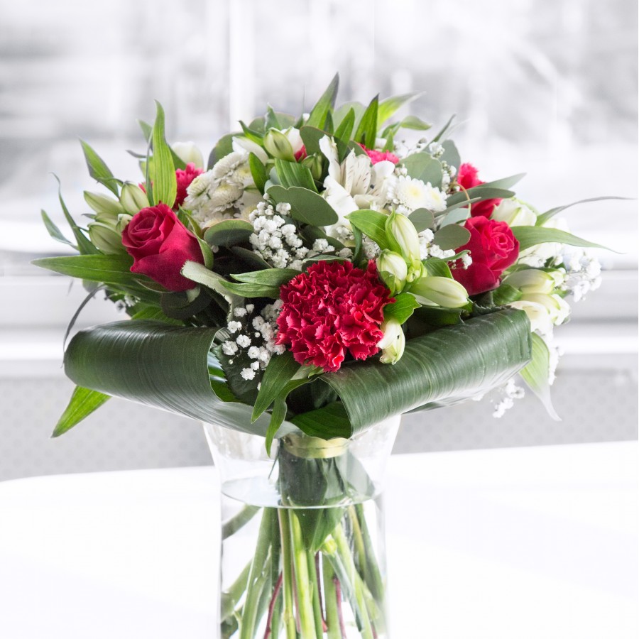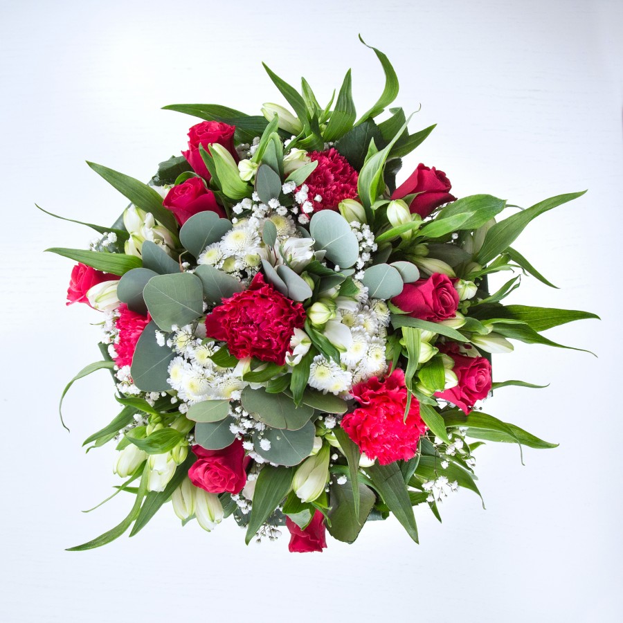 Unleash pure IMAGINATION with this elegant hand-tied bouquet from Flower Delivery South Norwood. Designed to spark creativity and romance, this arrangement blends luxurious red roses and carnations with sweet mini white chrysanthemums, airy gypsophila and graceful white alstroemeria, all framed by glossy aspidistra leaves. The rich red blooms create a striking contrast against the fresh white flowers, making this the perfect gift for anniversaries, romantic surprises, celebrations or simply to brighten someone's day.
